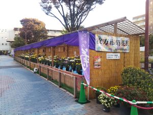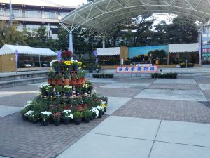 中央公園のステージのところです。今は菊花展でステージに展示品がありますが、普段は空いています。ふれあい通りを歩くと、よく右の屋根から外れた場所で、中学か高校の若い数人が踊りの振りをしていることがあります。短い、タンタンタン、タンタン、ぐらいの簡単な振りです。