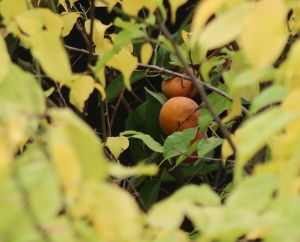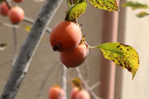 グラウンド端の法面に植わる樹々の葉っぱが美しく、フェンスの網の間から撮った中に柿の実が写っています。