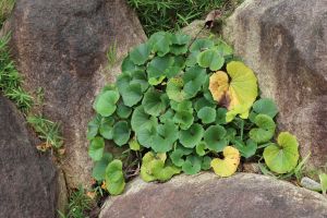 同じく岡東公園の前です。大きな石のあいだにつわぶきがほごっています。